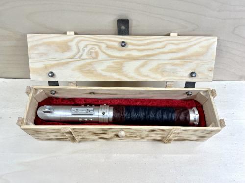 Damit das Lichtschwert HG2 auch gut aufgehoben werden kann, habe ich eine passende Holzkiste mit Samtpolsterung gebaut. So ist das Lichtschwert HG2 gut und sicher verstaut.