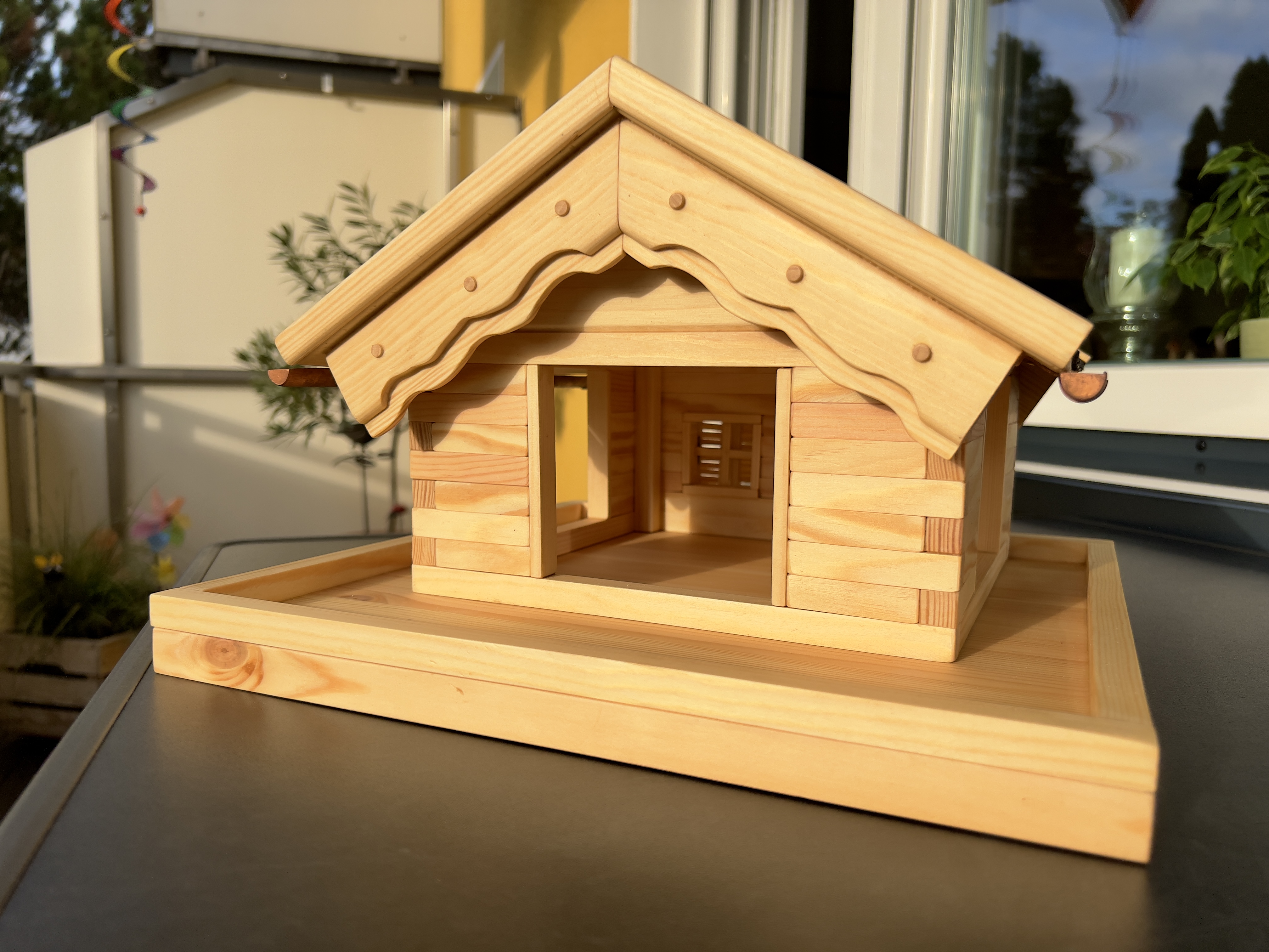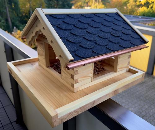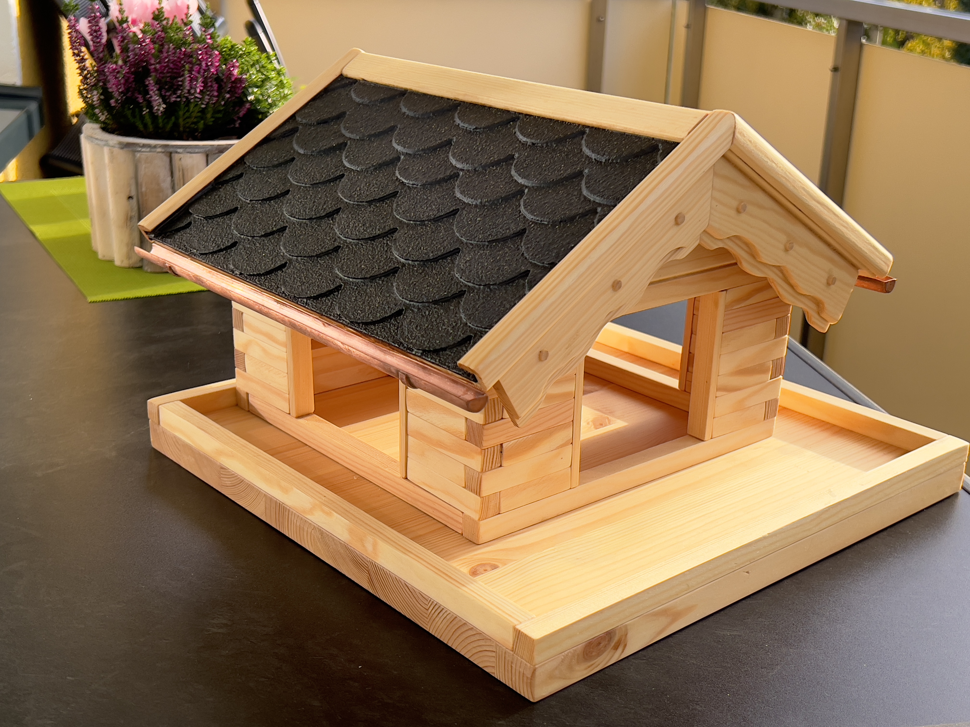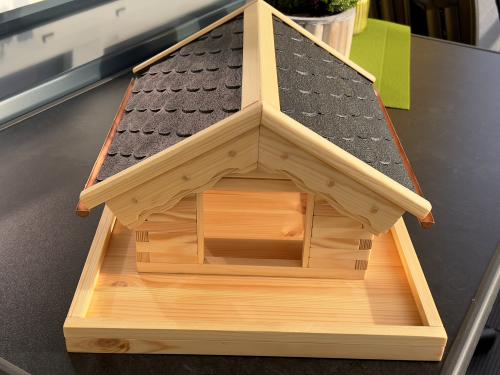 Zuerst habe ich mir mal im Internet ein paar Bilder von Vogelhäuschen angesehen. Nachdem ich ein schönes gefunden hatte, ging es an die Umsetzung nach meinen Vorstellungen mit kupfernen Regenrinne, Fenster-Klappläden und Grundplatte mit Regenabläufen.
