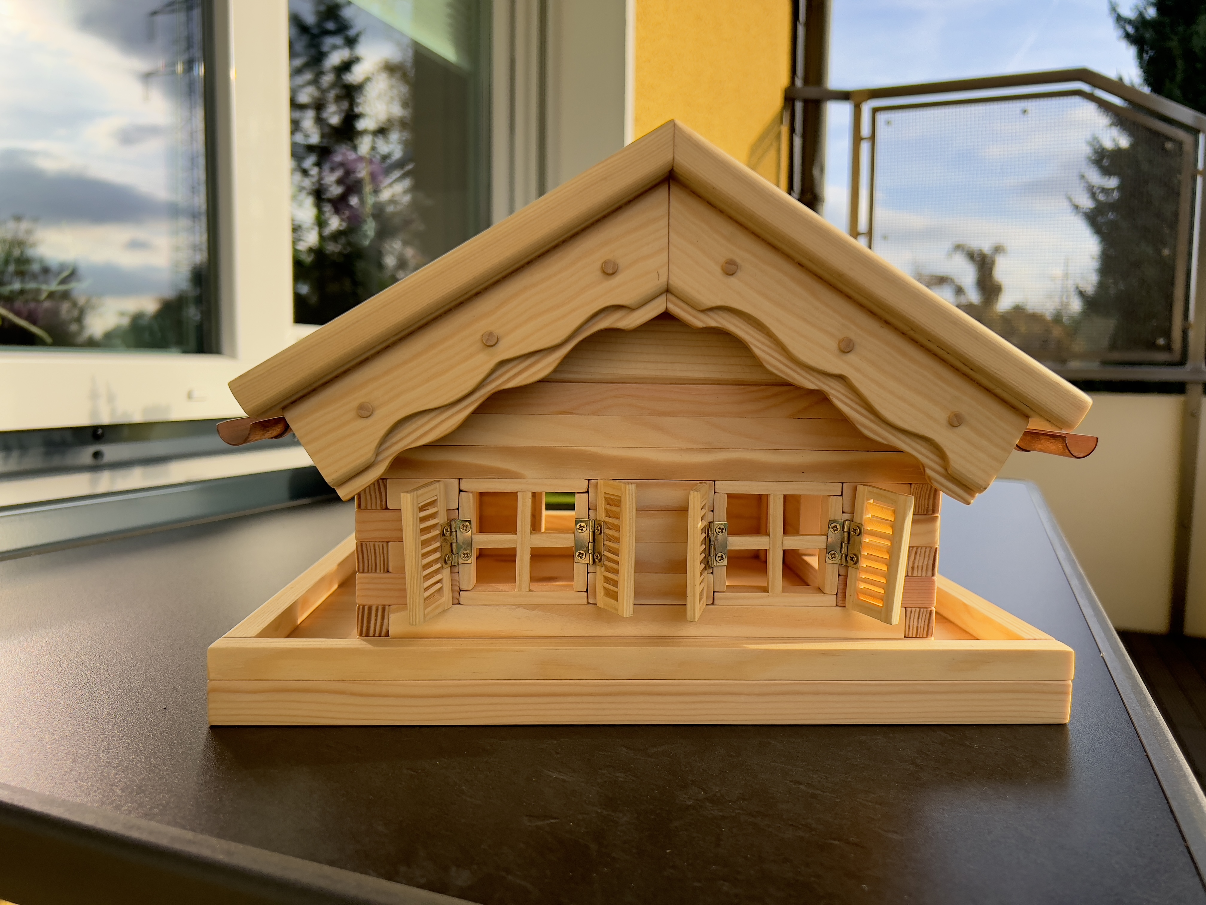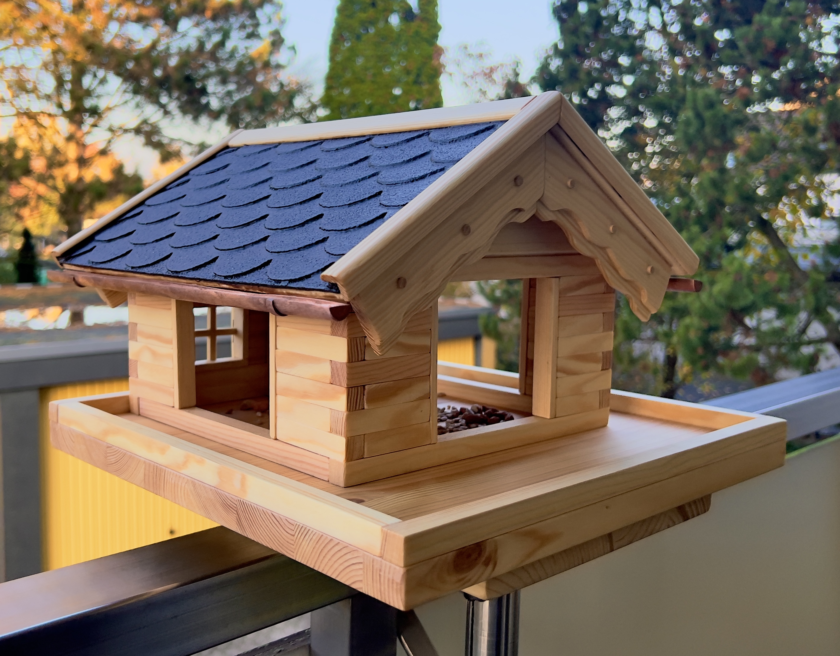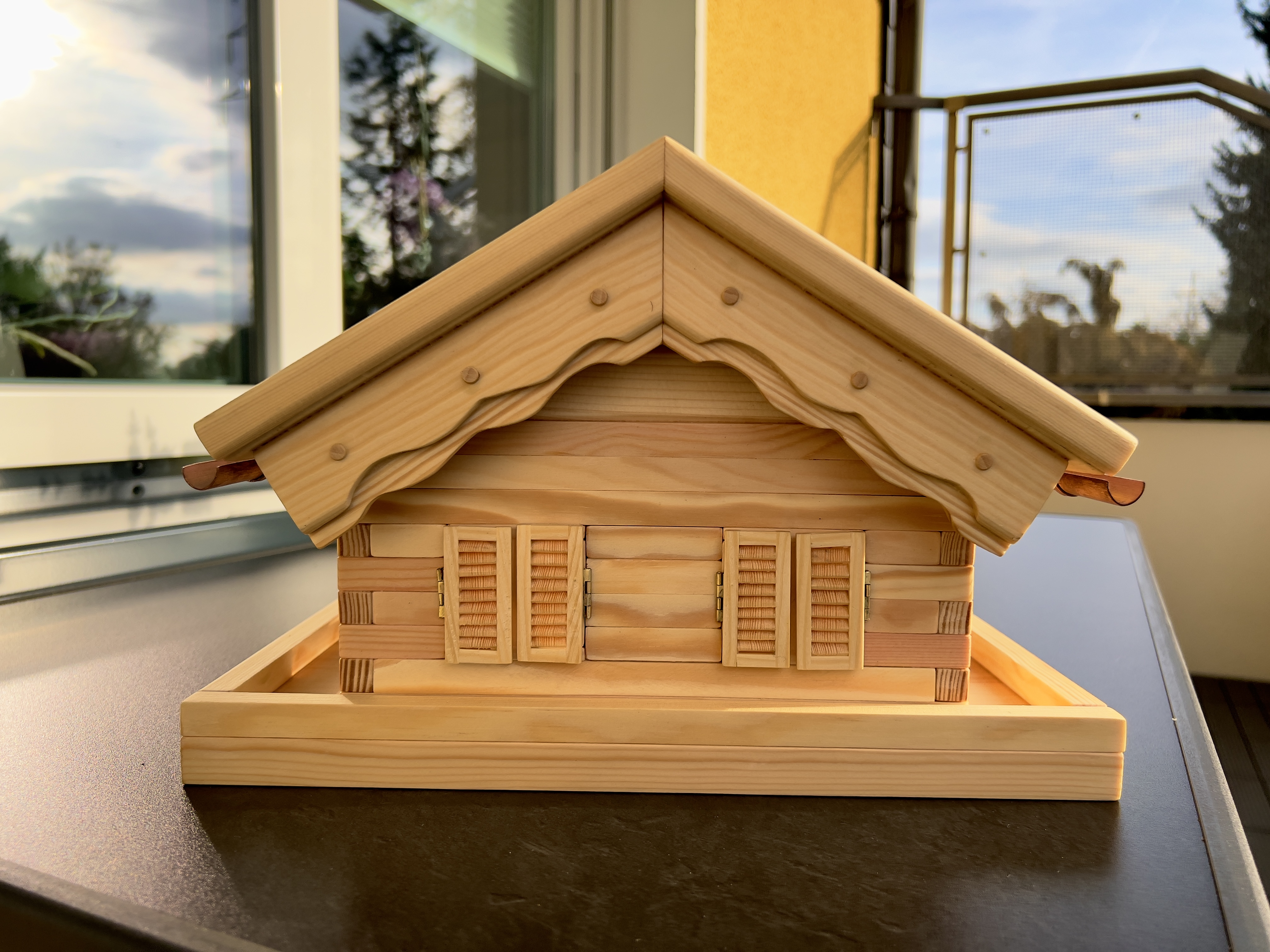 Zuerst habe ich mir mal im Internet ein paar Bilder von Vogelhäuschen angesehen. Nachdem ich ein schönes gefunden hatte, ging es an die Umsetzung nach meinen Vorstellungen mit kupfernen Regenrinne, Fenster-Klappläden und Grundplatte mit Regenabläufen.