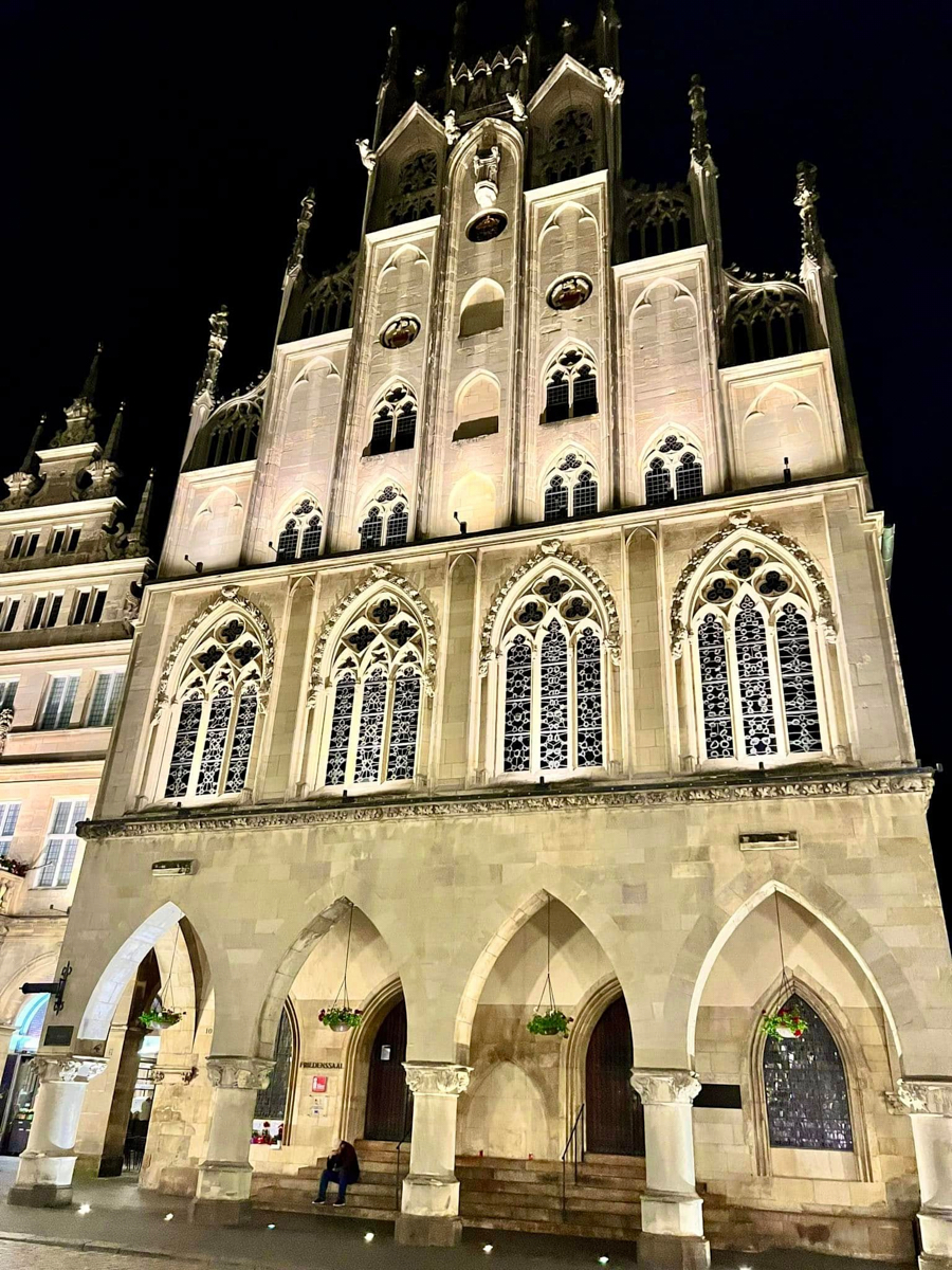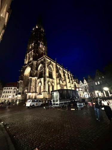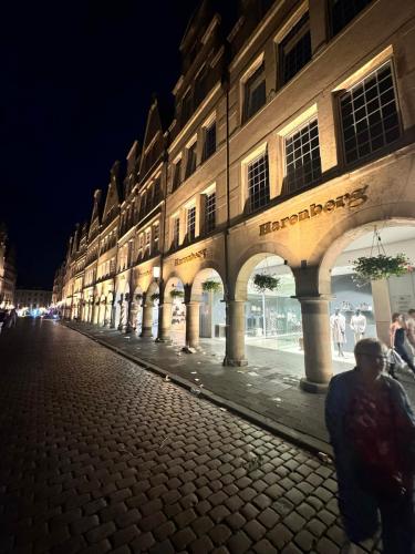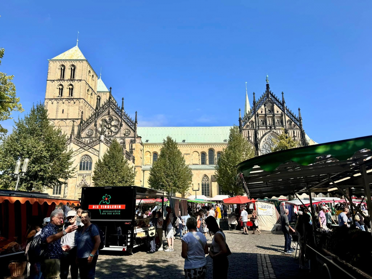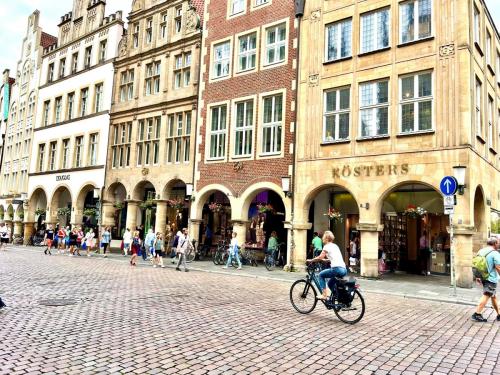 Münster ist eine Stadt im Westen Deutschlands. Ein bekanntes Wahrzeichen der Stadt ist der St.-Paulus-Dom aus dem 13. Jahrhundert mit gotischen und romanischen Elementen. Der Prinzipalmarkt ist von Giebelhäusern, dem gotischen Rathaus und der Lambertikirche aus dem Spätmittelalter umgeben. Im Park des barocken Fürstbischöflichen Schlosses befinden sich Gewächshäuser des Botanischen Gartens. Das Kunstmuseum Pablo Picasso beherbergt eine Sammlung von Lithografien des Malers.