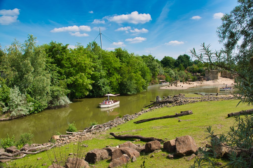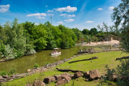 Afrika zeigt ein Dorf mit Haustierrassen, verschiedene Savannen und den Regenwald. Eine Bootsfahrt führt an den Landschaftsgehegen entlang. Die Boote erinnern von ihrer Bauart her an das titelgebende Dampfboot aus dem Film African Queen.