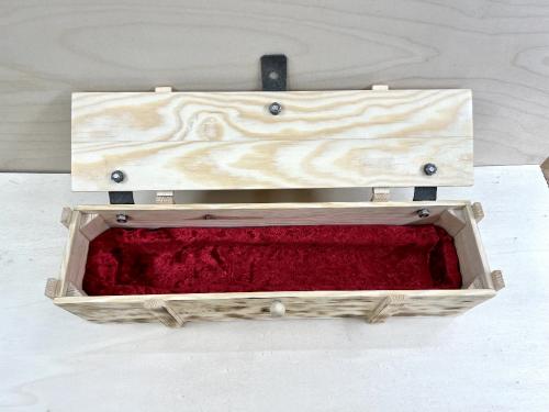 Angelehnt an eine Weinkiste, habe ich diese Holzkiste passend für das Lichtschwert HG2 nachgebaut. Zusätzlich habe ich aber noch eine Schaumstoffpolsterung, umzogen mit rotem Samt, hinzugefügt.