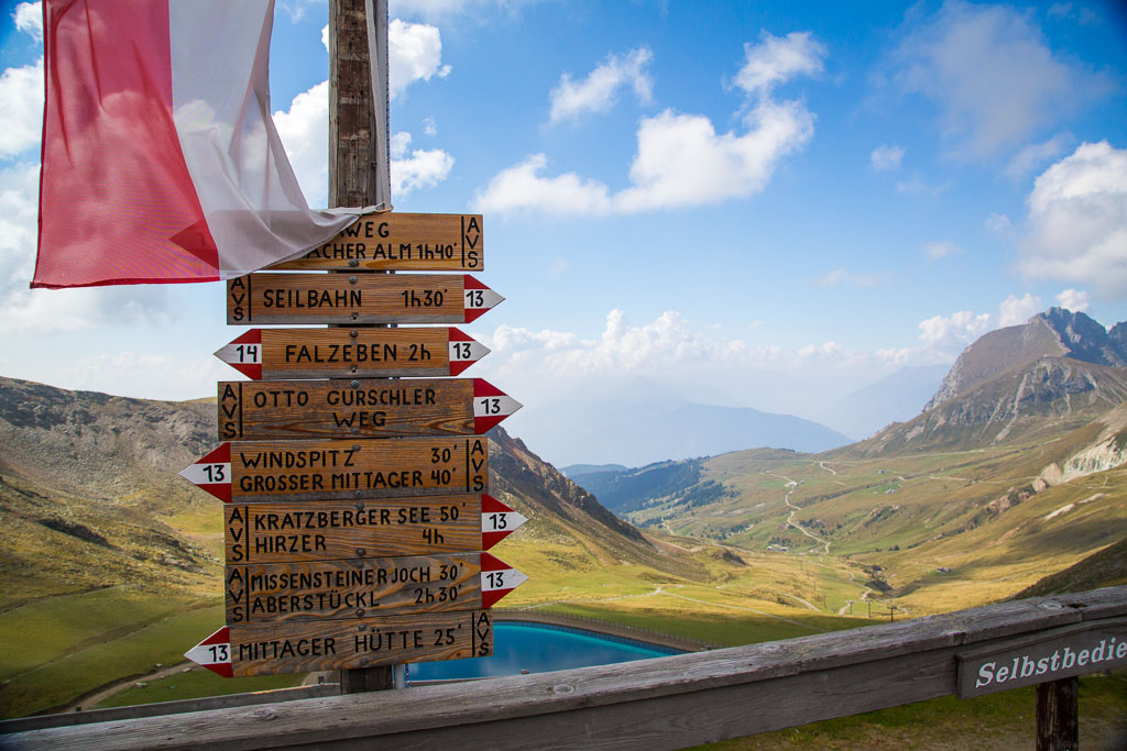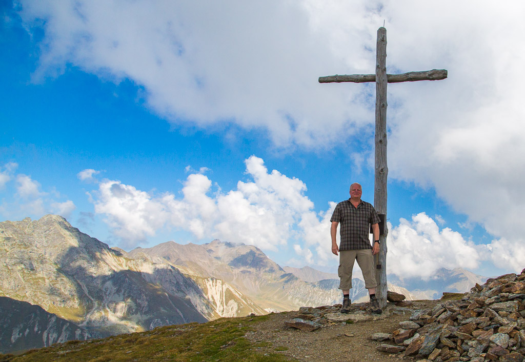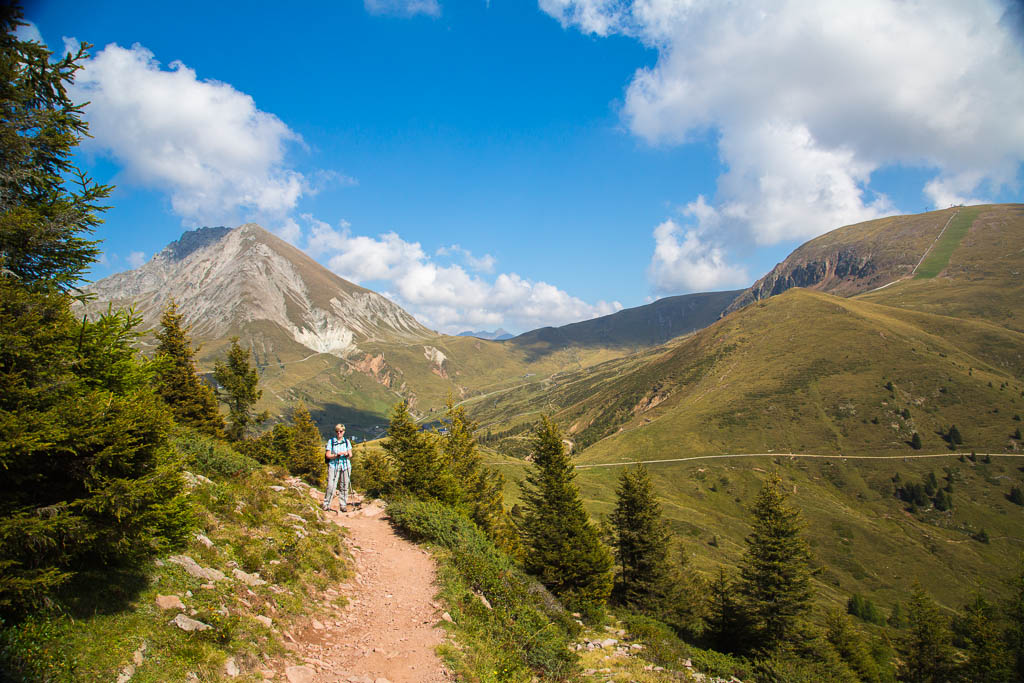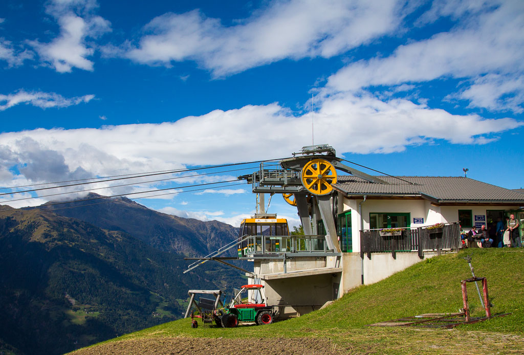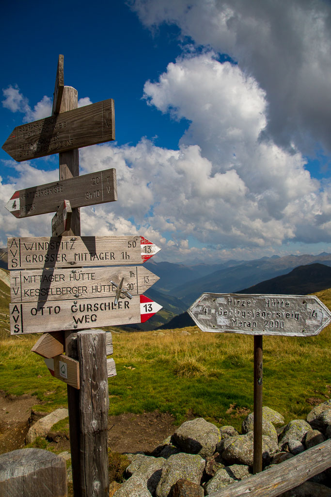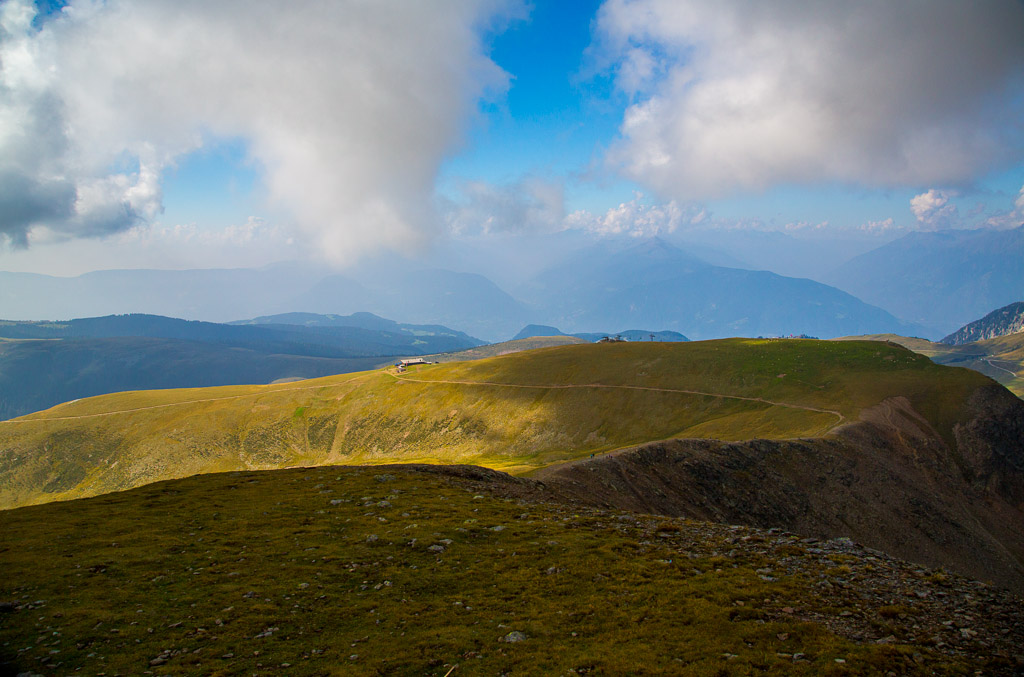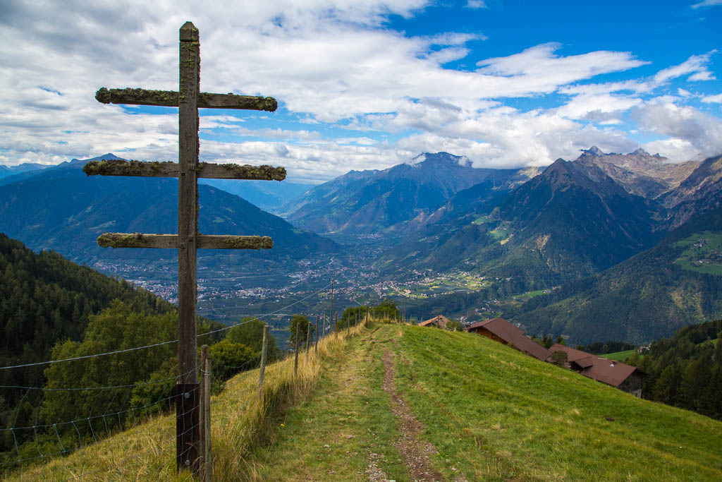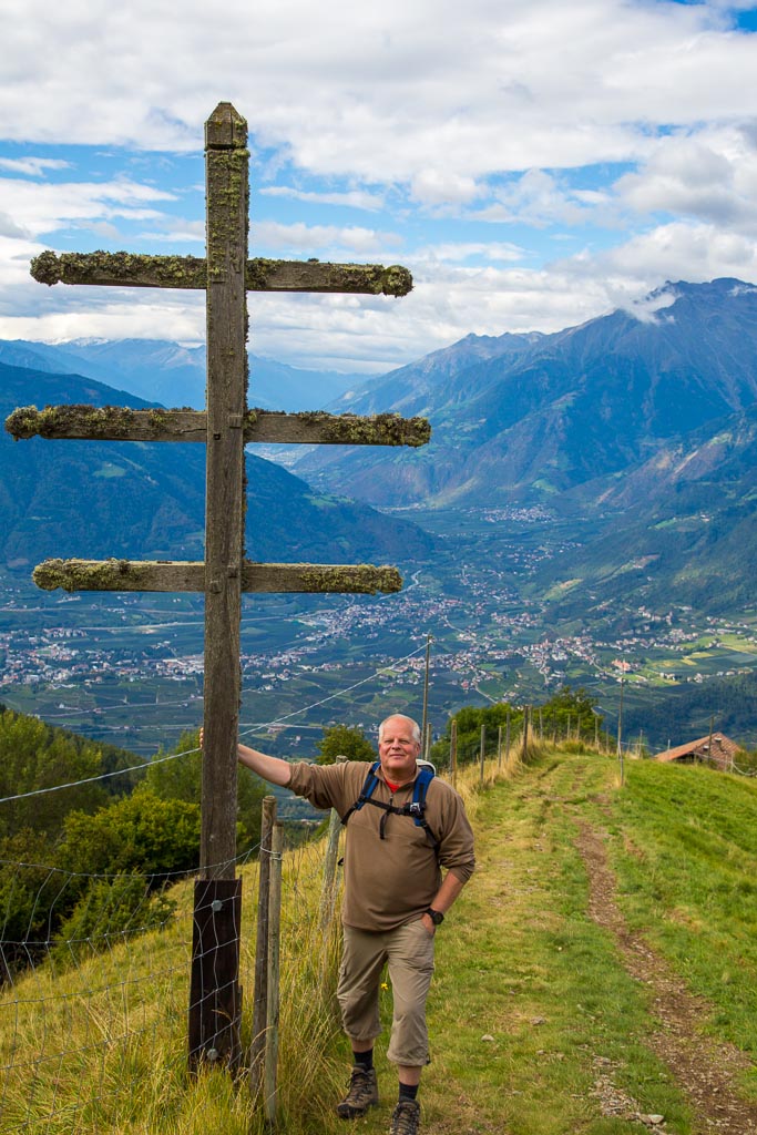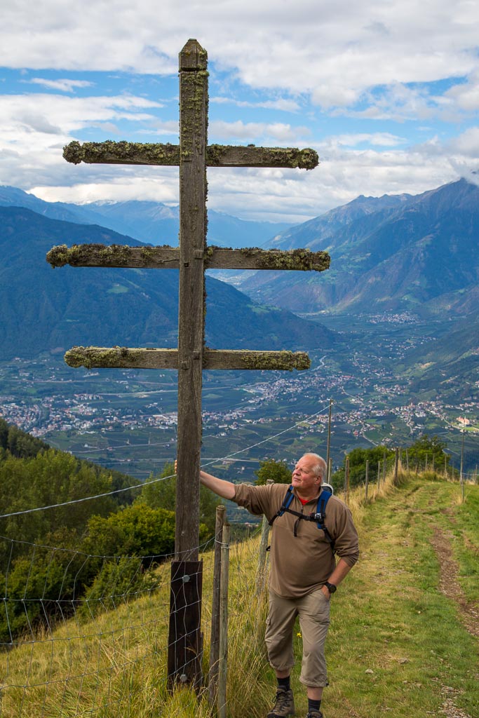 Mit der Seilbahn ging es zum Meran 2000. Von dort ging es einige km zum Sessellift, der uns zum Mittager führte. Dann ging es weiter über eine schöne Wiese zum Gipfelkreuz auf 2400m. Beim Abstieg machten wir Rast auf der Kesselberg Hütte, wo ich mein durchgeschwitztes Hemd trocknen konnte. Weiter ging es abwärts zu vielen schönen Aussichtspunkten und letztlich wieder zur Seilbahn Station. An diesem Tag betrug die Tour 13km und hatte einen positiven Höhenunterschied von 300 Metern.