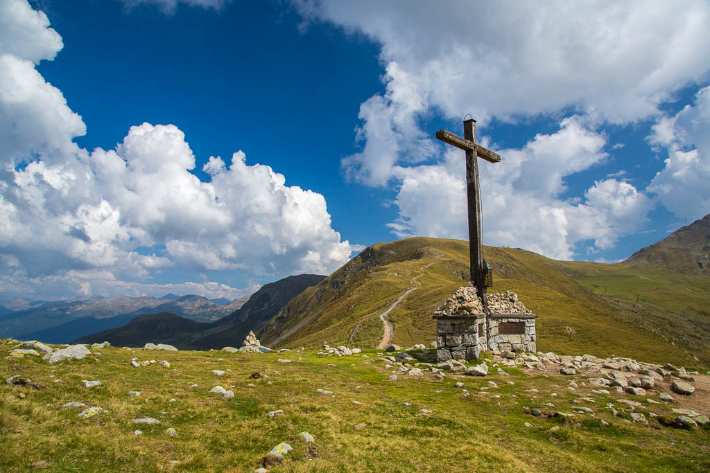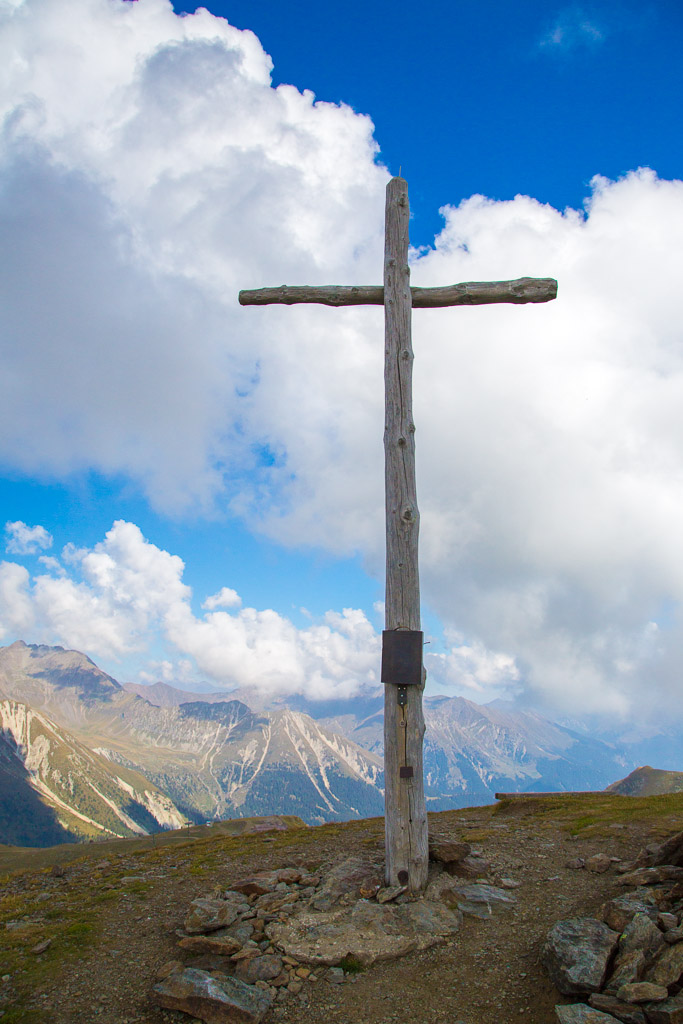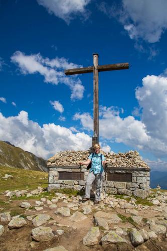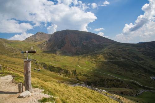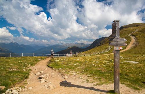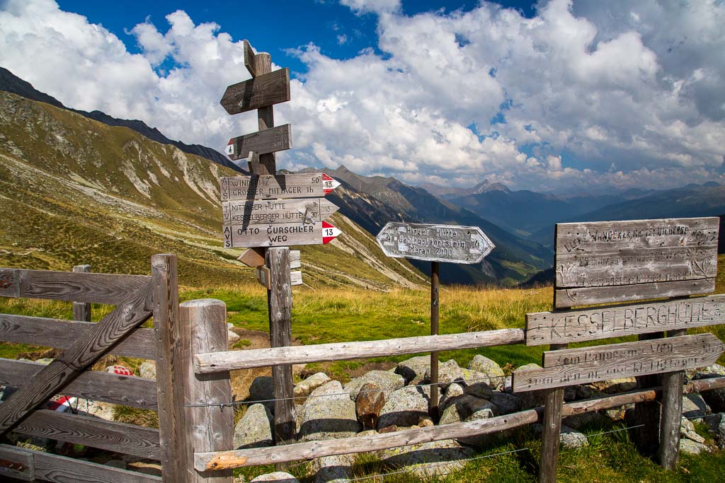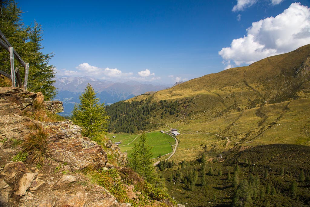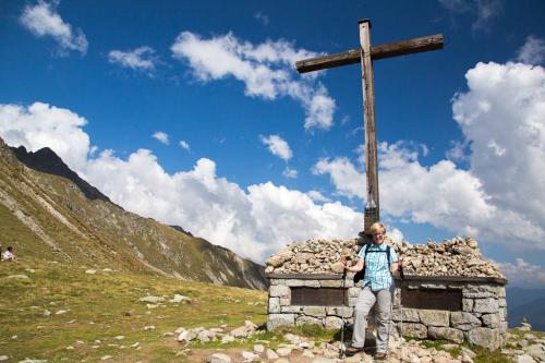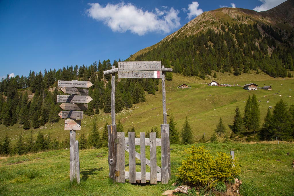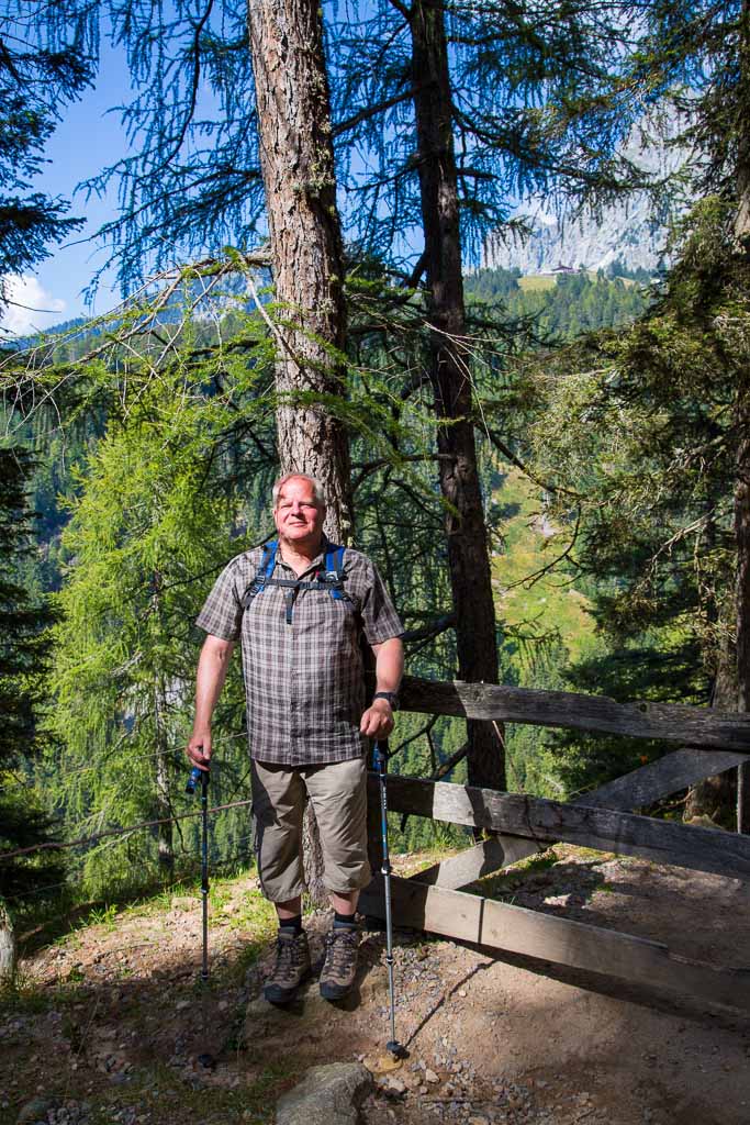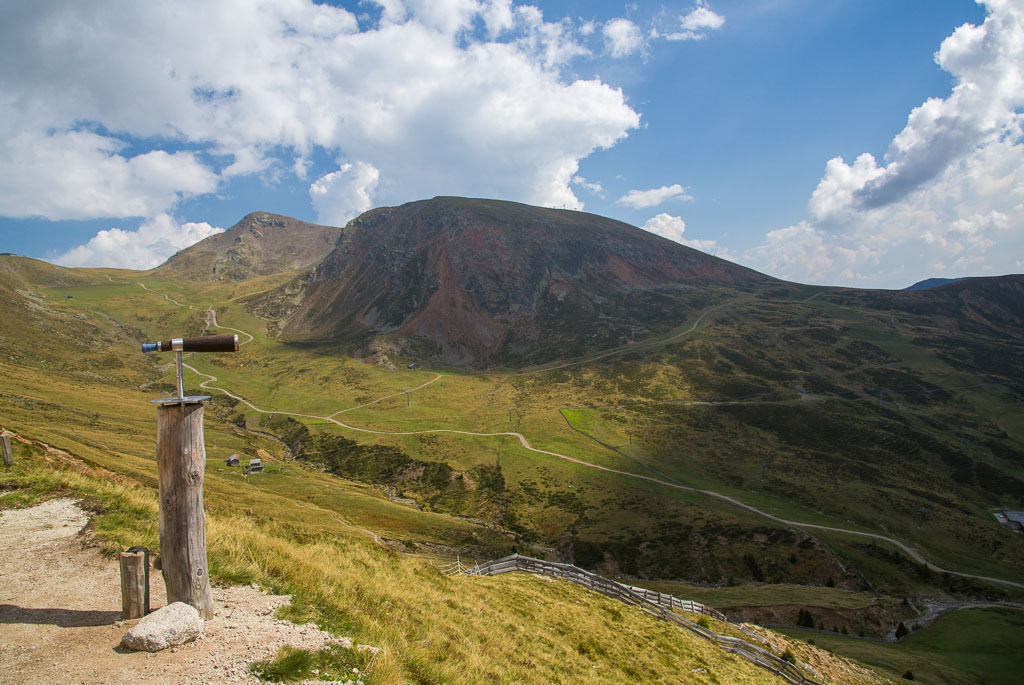 Mit der Seilbahn ging es zum Meran 2000. Von dort ging es einige km zum Sessellift, der uns zum Mittager führte. Dann ging es weiter über eine schöne Wiese zum Gipfelkreuz auf 2400m. Beim Abstieg machten wir Rast auf der Kesselberg Hütte, wo ich mein durchgeschwitztes Hemd trocknen konnte. Weiter ging es abwärts zu vielen schönen Aussichtspunkten und letztlich wieder zur Seilbahn Station. An diesem Tag betrug die Tour 13km und hatte einen positiven Höhenunterschied von 300 Metern.