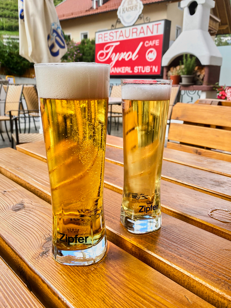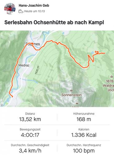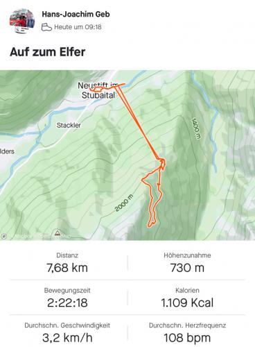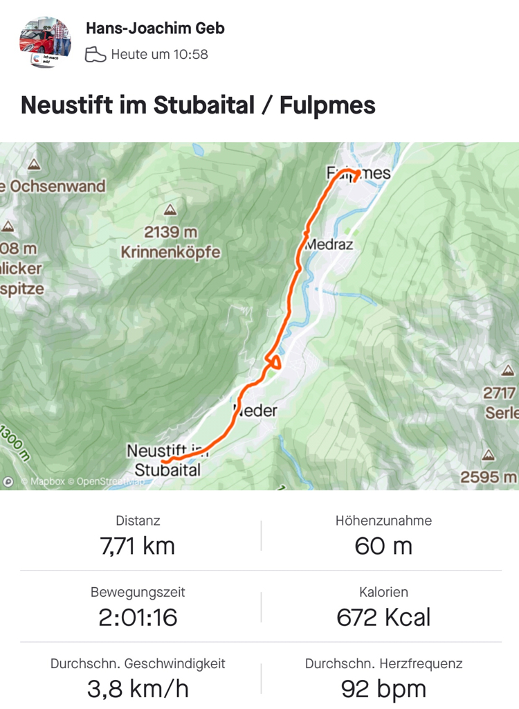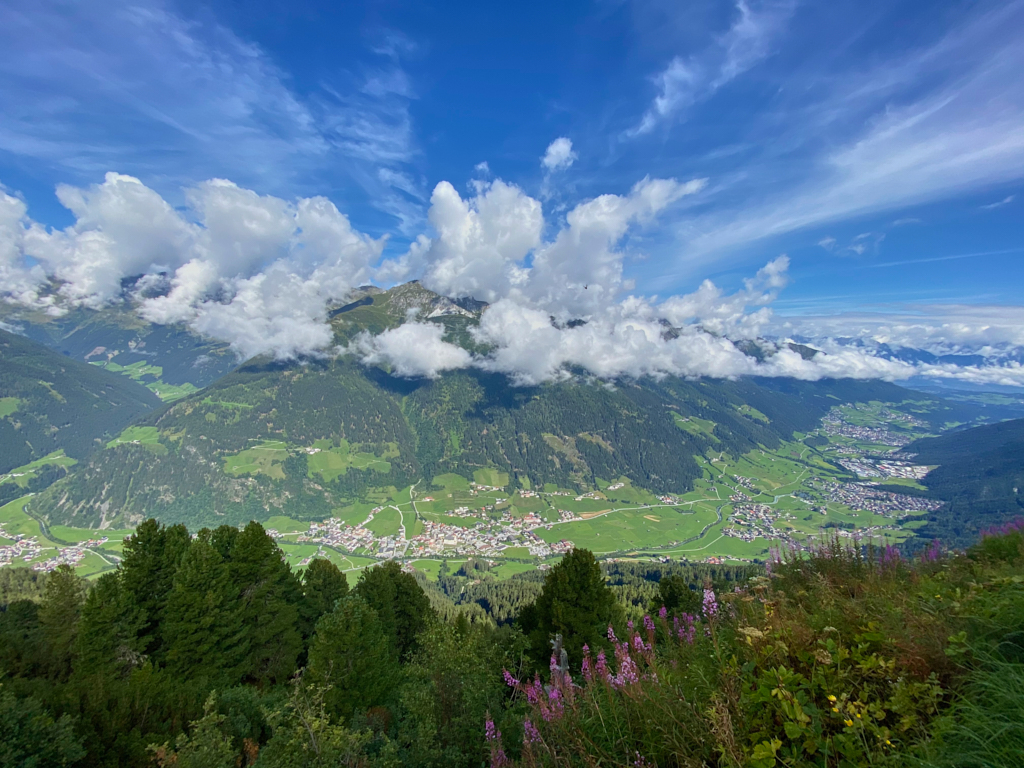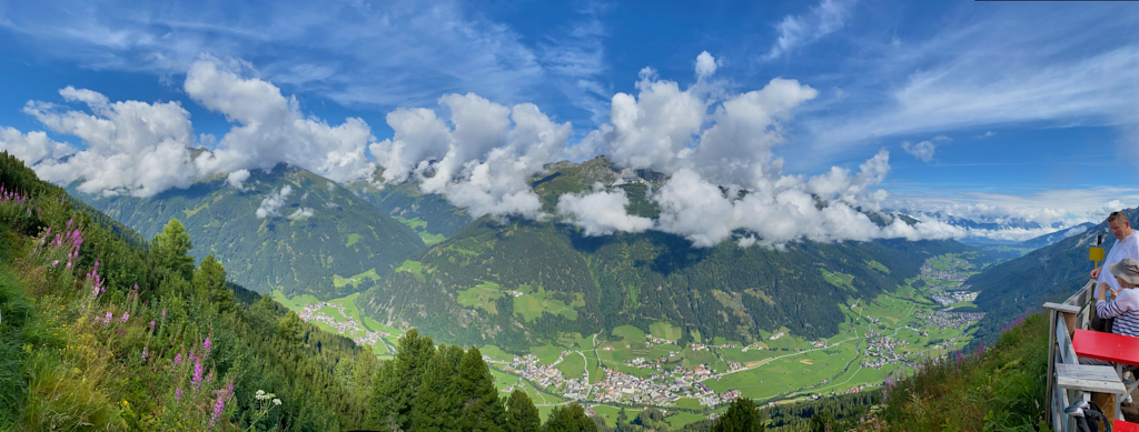 Das Gewitter vom Vortag hat seine Spuren hinterlassen. Die Wolken hingen tief in den Bergen und es regnete Anfangs noch. Am späteren Vormittag klärte es sich dann etwas auf und wir sind nach Fulpmes aufgebrochen, wo wir nach 2 Stunden und 8km angekommen sind. Da dort fast alles zu hatte, sind wir mit dem Bus wieder zurück nach Neustift. Dort haben wir Gert mit seiner Tochter Iris getroffen, mit denen wir ein leckeres Eis gegessen haben.