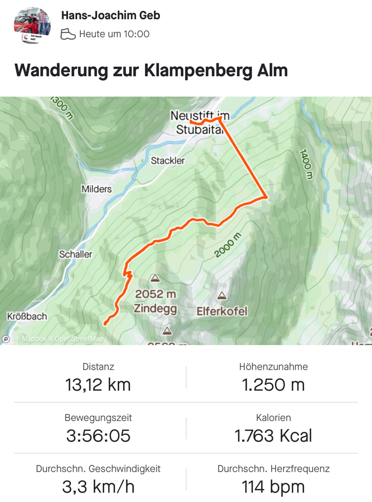 Als erste Wanderung ging es auf den Elfer, wo wir zur Klampenberg Alm aufgebrochen sind. Nach gut 2 Stunden sind wir dort angekommen. Nach einer Stärkung auf der Hütte haben wir den Rückweg angetreten. Nach 13km sind wir wieder in unserer Unterkunft angekommen, wo es 5 Minuten später angefangen hat zu Gewittern.