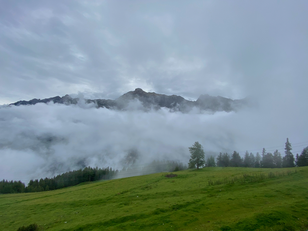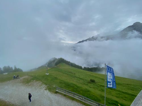 Da es so aussah, als wenn es den ganzen Tag immer mal wieder regnen sollte, haben wir uns entschlossen keine Wanderung zu machen. Stattdessen sind wir was durchs Dorf gebummelt, auf den Elfer gefahren um in die Wolken zu blicken und anschließend etwas Wellness im Hallenbad mit Aussenbereich und Blick auf die Berge. Am Nachmittag wurde es dann sogar wieder sonnig.